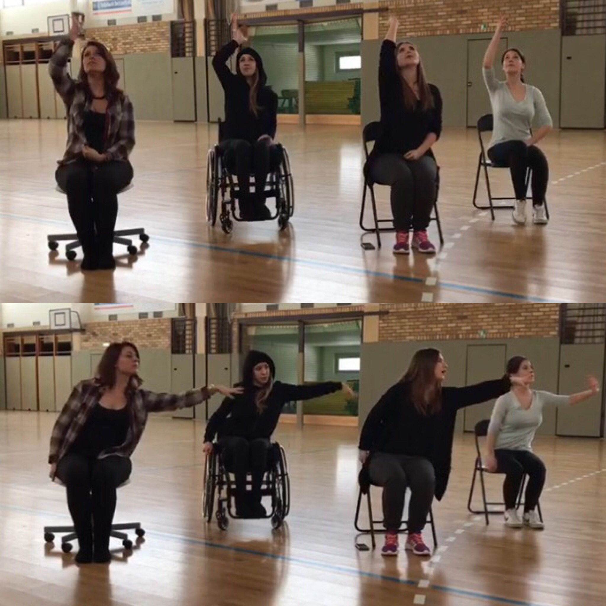 Es ist sehr anstrengend, immer alle Bewegungen ordentlich auszuführen. Oft muss ich mich an meinem Rollstuhl festhalten. Nach einer halben Stunde bin ich fix und fertig und brauch erstmal eine Pause. Wir haben bis zur Aufführung noch ein paar Wochen Zeit und Übung macht ja bekanntlich den Meister.