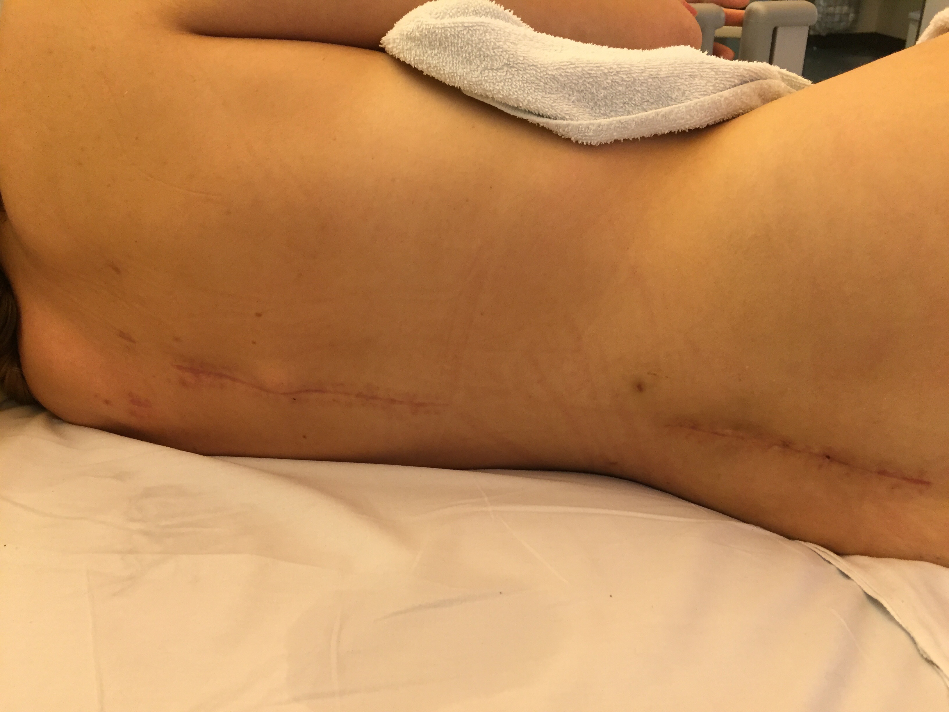 Ich habe eine Narbe am linken Knie, am rechten Arm, an der rechten Stirnseite, an der linken Hüfte, neben der rechten Brust und zwei lange am Rücken. Schon von Anfang an habe ich den Heilungsprozess dokumentiert. Jetzt, ein Jahr später, wollte ich von einigen Stellen Bilder zum Vergleich. Zeigen, dass Narben sexy machen!!