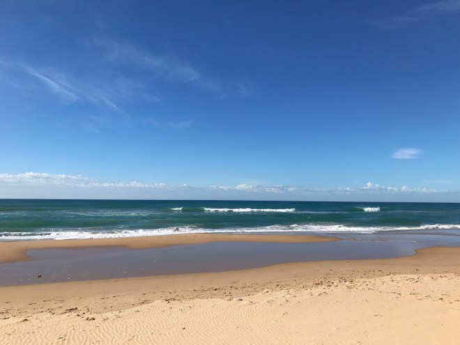 Das mega Wetter am Samstag nutzen wir, um an unserem Teint zu arbeiten. Schon gegen 10 Uhr waren es 30 Grad und wir hatten den Beach fast für uns. Nur wir, das Meeresrauschen und ein paar Surfer auf dem Wasser. Einfach richtig traumhaft. Nachdem fast jede Stelle mit Sonnenbrand bedeckt war, ging es mit „Berthi“ weiter. So haben wir unseren Camper getauft. 350 km lagen vor uns bis zum nächsten Halt.