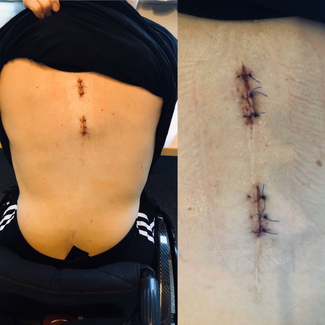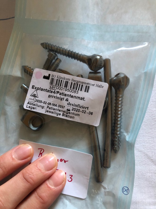 Meine Schrauben wurden auf dem minimalinvasiven Weg entfernt. Das heißt, es wurden nur zwei kleine Schnitte gemacht und nicht meine ganze Narbe geöffnet. Das Ganze dauerte höchstens eine Stunde. Ich musste anschließend 24 Stunden flach auf dem Rücken liegen und dann durfte ich langsam anfangen mich wieder zu mobilisieren. Erstaunlicherweise ging das recht gut. Ich hatte keine wahnsinnig großen Schmerzen. Eher einen richtig kranken Muskelkater rund um das Operationsgebiet. Das habe ich so nicht erwartet.